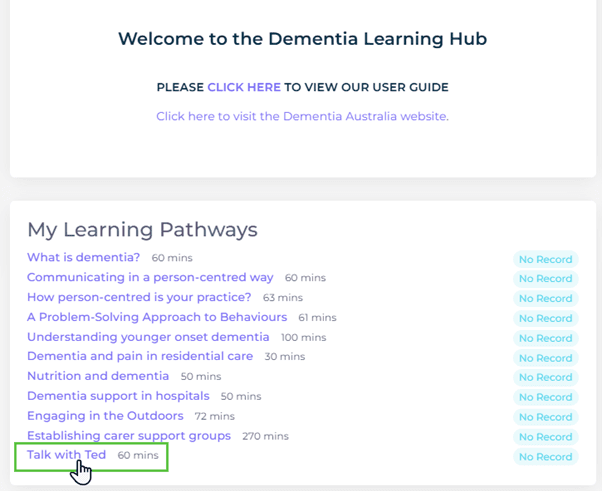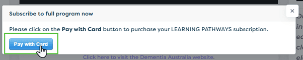 If you are still having an issue please reach out to our support team by emailing dementialearningsupport@dementia.org.au, please provide your username and a description of the issue.