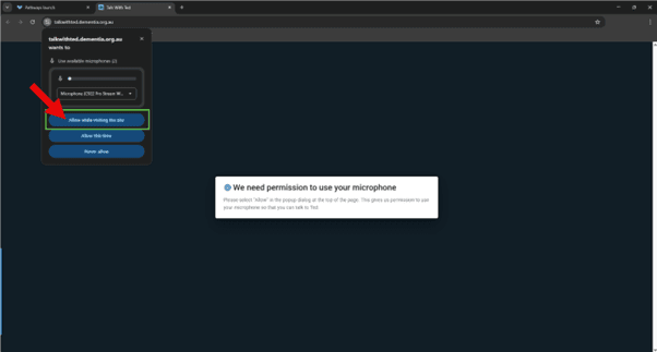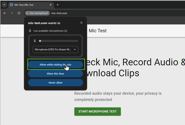 3. Your browser may firstly request permission to access your microphone, select “Allow while visiting this site”.